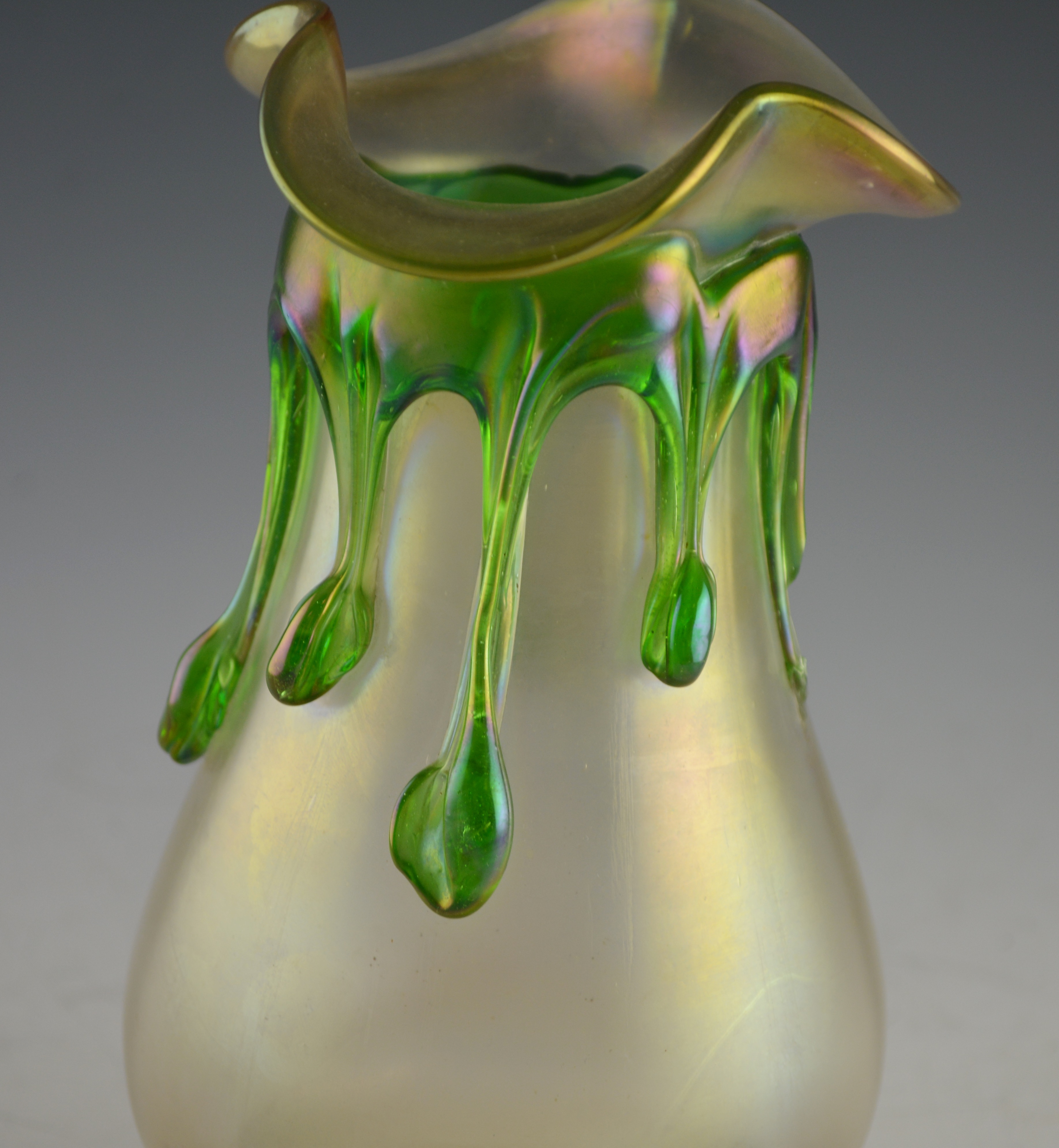 Iridescent art glass torpedo vase with feet and stripes, 1910.